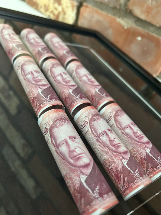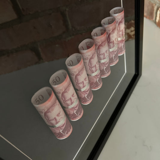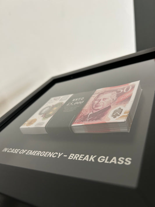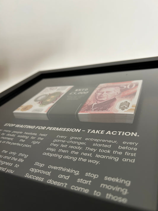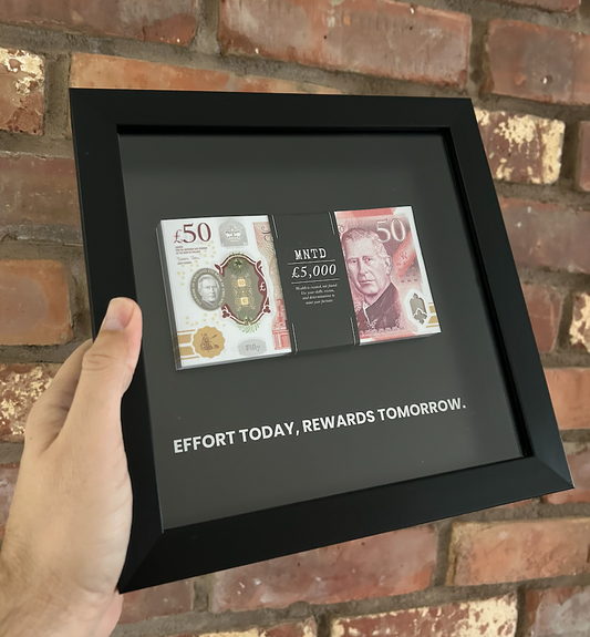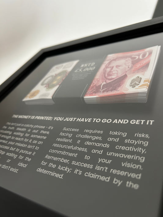 The "Five Stack"framed artwork is a bold statement of ambition, featuring five neatly stacked bundles of £2,500, wrapped in stamped money bands. Designed for those who move with intention.